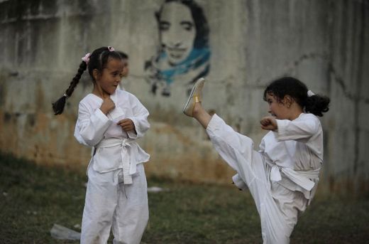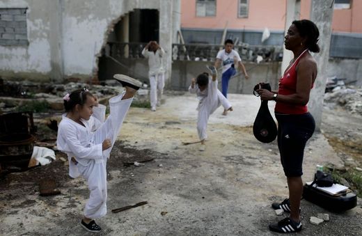在古巴首都哈瓦那一處洗衣店廢墟,武術教練瑪麗亞看著學生練習對打。古巴去年開放封閉的共產經濟,鼓勵民營企業。瑪麗亞利用這處廢墟,開設了她的武館。