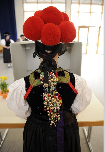 在白色的寬大草帽上,托著鮮艷的紅色或黑色羊毛絨球,未婚女性戴紅色,已婚女性則戴黑色,手工製作。女性佩戴大絨球帽時,穿黑色寬鬆長裙,腰部摺疊多層;上身穿短袖的白色縫花襯衣,加上無袖的天鵝絨緊身胸衣,長方形衣領有彩色鑲邊。