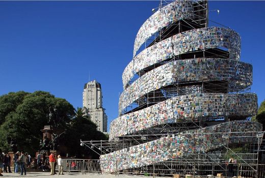 阿根廷藝術家瑪塔‧米努金以3萬本書搭成「巴別塔」,放置在布宜諾斯艾利斯市中心的聖馬丁廣場。這個「圖書巴別塔」