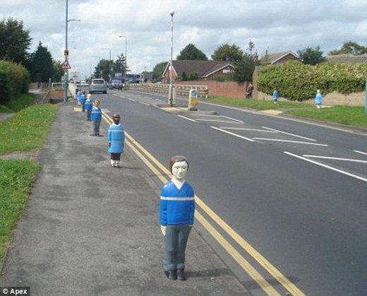 英國普利茅斯市一所小學附近的路邊,最近安裝了許多小孩模樣的「人形交通樁」,希望提醒車輛駕駛人降低車速,確保學生安全過馬路,但卻把過往行人嚇壞了。