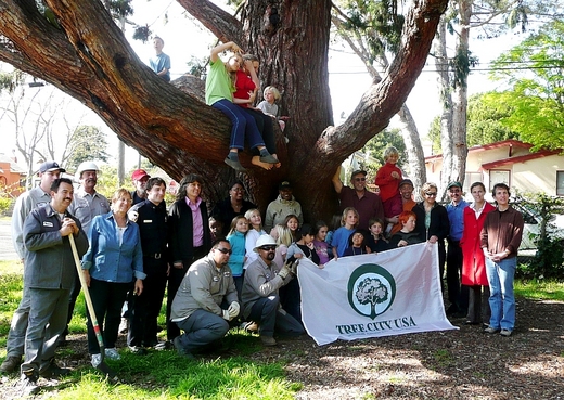 圖:獲得樹市認證的伯克利市,市民在大樹下合影留念。