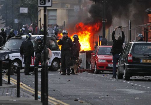 圖:倫敦暴力衝突中,暴徒放火燒毀車輛。