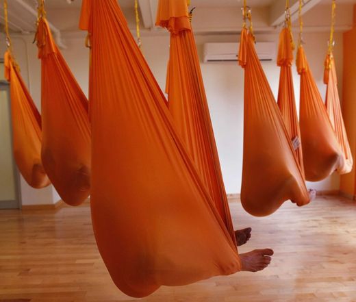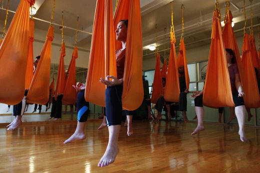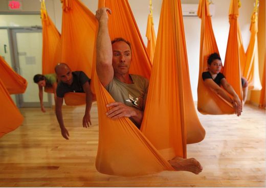紐約「Om工廠」瑜伽中心開辦「反重力瑜伽」課程,讓學員「飄浮」在半空中。藉著懸掛在天花板的吊床做支撐,讓人如同包在繭裡,輕易做到高難度的倒立瑜伽。這種新式瑜伽風行於美國、愛爾蘭與義大利等地,現在也流行到了英國。