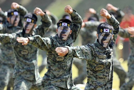 2011年10月,南韓迎接第63屆軍人節,與美國進行聯合演習。南韓特種部隊士兵臉上塗著迷彩,展示技能。(法新社、美聯社)