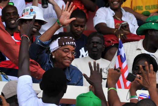 圖:諾貝爾和平獎得主、賴比瑞亞總統瑟利夫和(中)舉手,接受民眾祝賀。(法新社)
