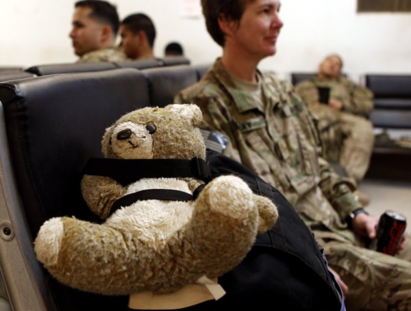 圖:心理治療師格雷少校完成一年任務,帶著她的泰迪熊,準備返美。(路透)