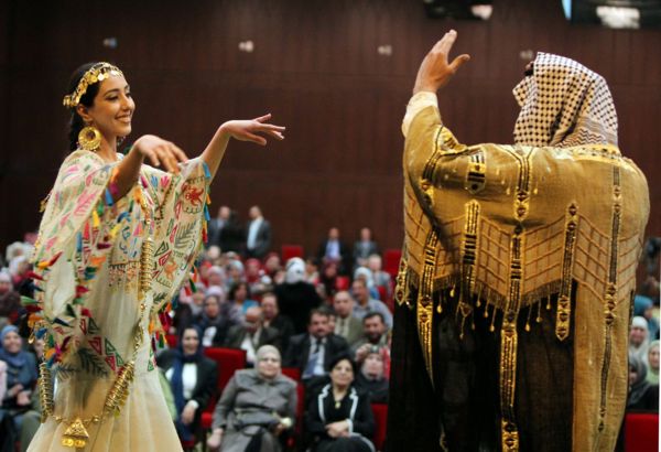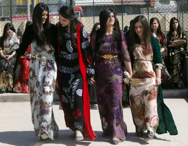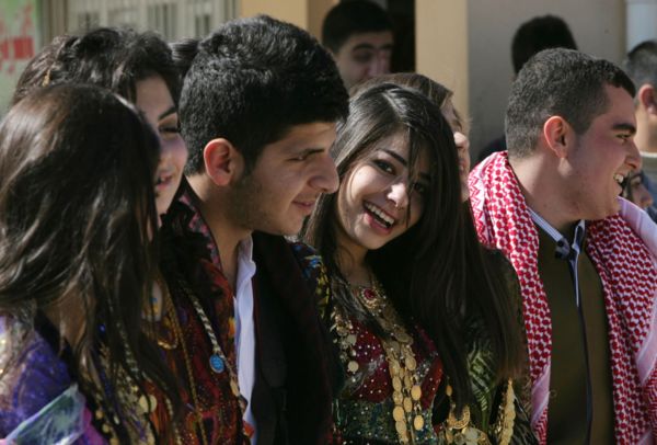 圖:在伊拉克北部的埃爾比勒市,庫德族女學生穿傳統服裝,慶祝婦女節。(法新社)