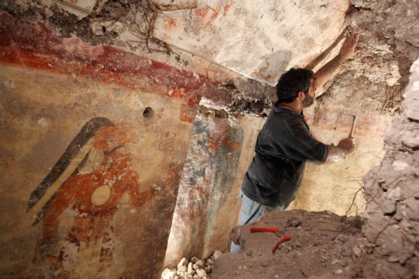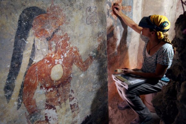 圖:馬雅密室的壁畫已褪色,考古學家貝絲正小心清理。