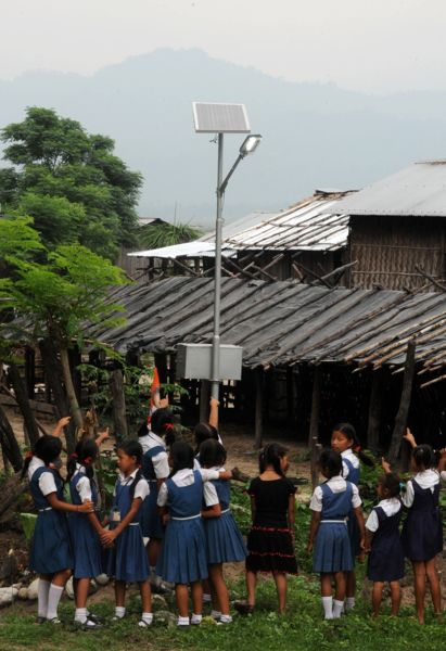 圖:印度一處偏遠村落,裝設了第一個太陽能電板,學童爭相觀看。