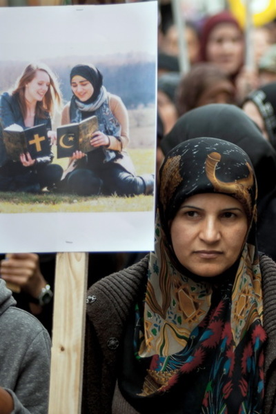 圖:德國穆斯林參加抗議活動,海報上的伊斯蘭教與基督教徒,各自拿著古蘭經與聖經,代表和諧相處。