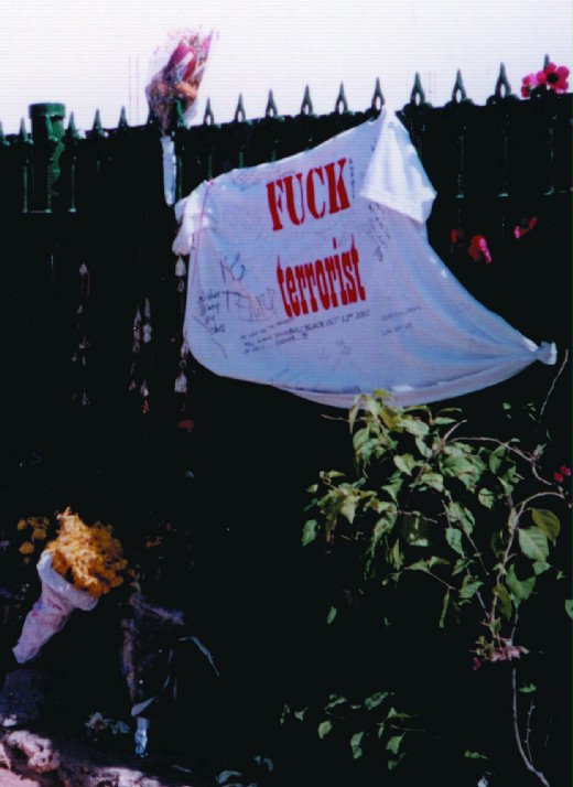 那條雷貢街,來來回回走過好幾趟;那天沒有執意要去哪裡,不經意卻來到夜總會遺址,沒有重建,廢墟簡單的圍籬上,還貼著死難者的照片,地上放著鮮花、蠟燭;最醒目的是:掛著一件白色T恤,用鮮紅墨水大大寫個FUCK,下面小字是Terrorist。