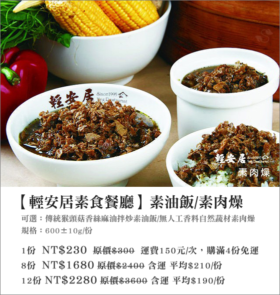 商品訊息簡述: 平均每份最低只要190元起(4份免運)即可購得【輕安居素食餐廳】傳統猴頭菇香絲麻油拌炒素油飯/無人工香料自然蔬材素肉燥任選1份/8份/12份(600±10g/份)。