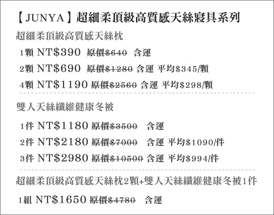 商品訊息簡述: 只要390元起(含運)即可購得【JUNYA】原價最高10500元超細柔頂級高質感天絲寢具系列:(A)超細柔頂級高質感天絲枕1顆/2顆/4顆/(B)雙人天絲纖維健康冬被1件/2件/3件/(C)天絲枕2顆+雙人天絲冬被1件。