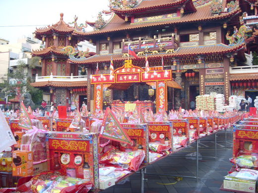 每每到了普渡日, 廟埕排滿長桌, 小孩子還是有辦法找樂子, 到處鑽長桌底也能捉迷藏. 黃昏一到, 被抽中的里別從各地運送祭品普渡廟門口, 各式祭品五花八門看的眼花撩亂, 似乎在比高下, 常常可以發現巧奪天工的藝術雕琢, 就像看展覽一樣. 現在看不到如此搞剛的祭品了, 聽說是各戶給錢統一交里長代勞, 所以看到的幾乎都一模一樣, 真的是整箱拿來拜省事.
