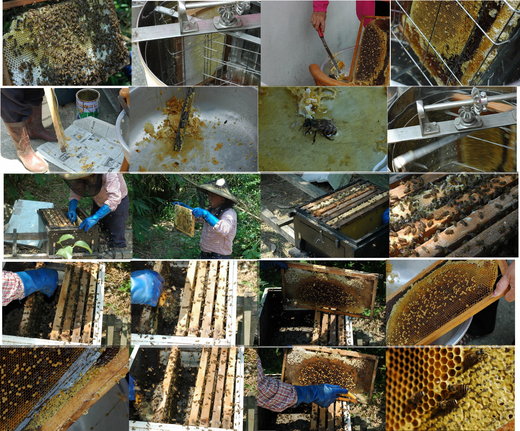 野蜂的體積小,但個性並不像想像中的那麼野,當將蜂板從蜂箱中拿出來時,成群的野蜂也跟著飛出來,但牠們並不螫人,當然是在不激怒它們的前題下,每個蜂箱放有四片蜂板,其中只容許有一隻蜂王,每次取蜜也只取兩片蜂板,總要留些蜜給蜜蜂吃,由蜂板取蜜的過程中要先括掉些蜂臘,再將蜂板放入取蜜筒中,利用離心力的原理將蜂蜜搖出,新鮮的蜂蜜透明度很好,而且不斷有氣泡往上冒,因此瓶蓋不能旋太緊否則會爆瓶。
