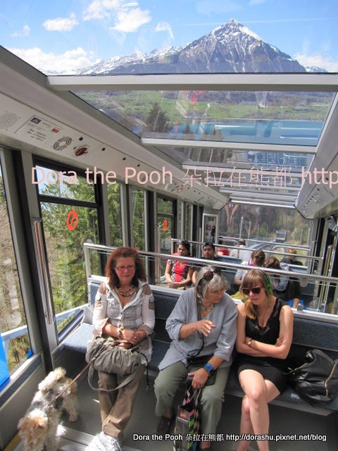 ( *朵拉貼心提醒: 若你是來瑞士旅遊的觀光客, 一定要找機會搭乘瑞士的登山火車, 無論哪裡的都行. 因為瑞士的登山火車行駛山路多在風光明媚的阿爾卑斯山脈區 { #這裡注意: 所謂山脈, 就是俗稱的阿爾卑斯山. 它其實是許多座山連綿在一起的大型山脈區, 就算山與山間有河谷間隔, 彼此距離還是很近唷. } , 火車結構堅固, 車速平穩, 許多登山火車更是以 60 度以上的角度爬坡, 車前後與車頂都是大型窗戶, 美景盡收眼底 (當然, 下坡時也是險象環生!) – 請見下圖 .