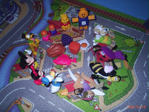 開完了這場派對我才發現,前前後後在麥當勞搜集了這麼多玩具!還好現在很多國家的麥當勞兒童餐都可以隨意搭配(我都是主餐配水果和牛奶),要不然我家兄弟倆只有看別人玩的份了!^^ 透過這個遊戲小朋友對冷落已久的玩具又熱絡起來,結果媽咪一個玩具沒有丟,因為兄弟倆不準!> <"