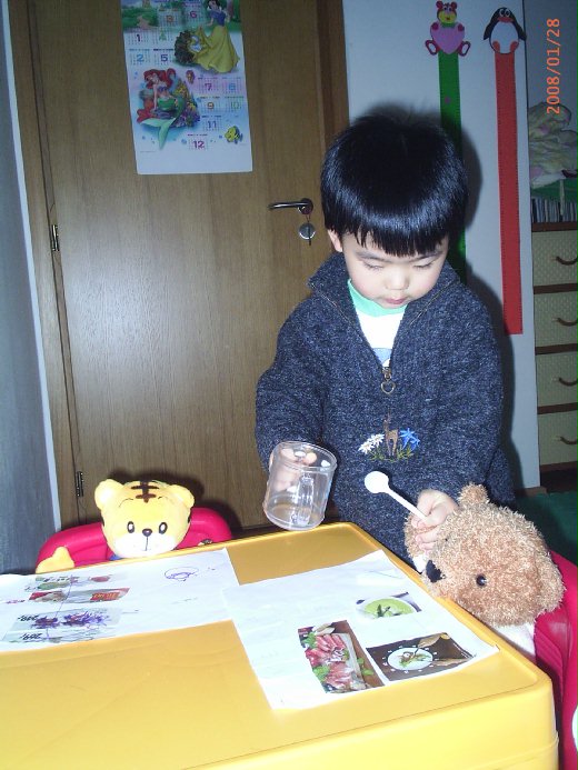 派對一開始,我們就把最大泰迪熊和巧虎布偶放在小朋友的遊戲桌椅上享受高級餐廳的服務。兄弟倆充當服務生,遞上自己做的菜單,並馬上告知那些餐點沒有了,所以只能點A和B。收走菜單的時候還煞有其實的告訴客人,"我現在才要煮,所以要等一下喔!"(哈哈~這是媽咪常用的台詞啦!^^)。上菜的時候,兩個服生還貼心的用台語叮嚀:"燒燒,ㄅㄨㄣ ㄅㄨㄣ ㄝ喔!"。之後買單哥哥伸手向客人說:"四佰塊錢。",我說:"好貴喔!",哥哥無所謂的說:"好,那three dollars。"。哈哈,這就是沒有金錢概念的哥哥!