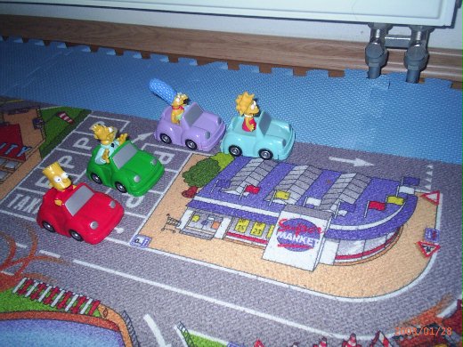 這邊餐廳服務完了,接下來就是一堆卡通玩偶的野餐時間了。我們把Mickey, Minnie,Donald Duck,Pluto,Snoopy, Winnie the Pooh,Kermit the frog,一群手指布偶,和幾隻麥當勞送的小動物擺在地墊上的公園圍成圓圈,再把一些玩具食物放在圈圈的裡面讓大家享用。當這群小玩偶在享受pinic的時候,剛剛用完高級餐點的泰迪熊和巧虎就騎著布偶馬和大象到處遊覽看風景了。當所有的玩偶都吃的差不多也玩的很盡興之後,小朋友就派遣Simpson家族開車到超市採買下次派對要用的東西,準備隨時再來一場toy party!