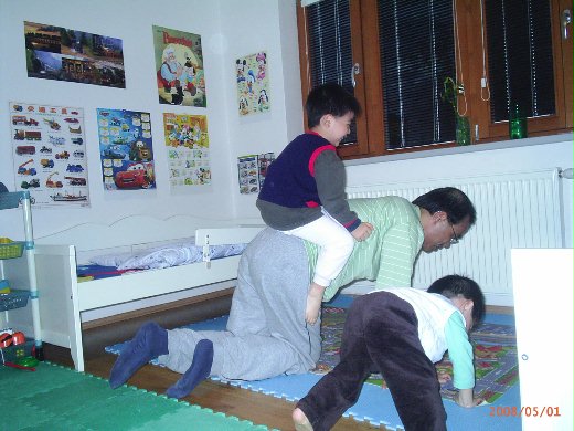 和爸爸一起陪孩子們學習的好處就是,爸爸可以補足我的缺點。例如體能方面的活動我就萬萬不能(因為我真的很少運動,很容易拉傷或扭傷),但是爸爸就可以讓兄弟倆輪流騎在背上假裝是在騎大象一樣慢慢的爬,讓小朋友真是樂翻天!這樣讓他們騎在爸爸背上除了讓兩個寶貝更崇拜爸爸之外,同時也是訓練平衡感的好活動,一舉兩得。不過兄弟倆畢竟有點重量,為了不傷身,爸爸都會要求他們在騎大象之前先幫忙按摩,熱絡一下爸爸的肌肉。就這樣我教小朋友如何幫爸爸按摩,而他們也剛好學到另一種方式可以名正言順的對人拳打腳踢,真是讓兄弟倆佔便宜了!^^其實孩子們的體形雖小,但是力氣不見得小。有時候他們打錯地方爸爸也是會喊痛,所以兄弟倆從按摩中了解,力氣用錯地方是會讓對方很痛,若力氣用對了地方就會讓人很舒服喔。