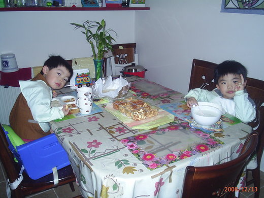 要出門兩個星期,家裡的冰箱一定得清空。不過等我們回家後,因為太累了,當天也懶得去超市買菜。結果隔天早上起床要吃早餐的時候才發現,除了保久乳,就沒有任何比較營養的早餐了。第一次克難的在早上吃餅乾和薄餅,爸爸連連對我們道歉。沒想到兄弟倆看到桌上的早餐卻樂得不得了!哥哥高興的問「要喝tea time嗎?」而弟弟早就在一邊高歌「喝tea time!喝tea time!」看他們吃的又多又高興的,這那是克難早餐啊,簡直是山珍海味嘛!哈哈哈!