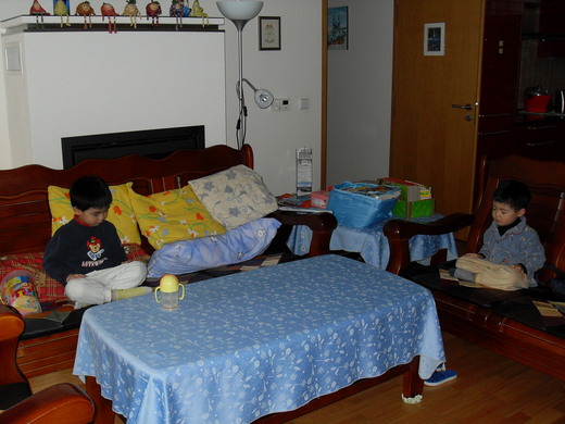 弟子規在上個學年我們就從頭到尾唸完了,但是我沒有強迫小朋友們要背,想當然,唸完沒多久就忘得差不多了。去年開始接觸弟子規的時候,我只希望透過弟子規讓寶貝們能多一些道德倫理的概念。最近為了讓哥哥多練習注音拼音及認國字,我又把弟子規拿出來複習。不過因為是第二輪回了,同時為了加強學習效果,這次就規劃了進度表及學習程序。要開始學習弟子規之前,兄弟倆都得盤坐靜聽整片導讀CD(每次聽約三十分鐘的片段)。一來可以專心的聽講解,多了解這些字的含意。二來,順便讓停不下來的兩個皮蛋學習一點定力。等聽完CD之後,哥哥就會自己拿著書一個字一個字看著唸。當然,哥哥如果可以偷懶用背的,他就盡量背。只是弟子規這麼長,他也背不了多少,所以只要哥哥不認字亂猜,很快就出錯了。在這第二輪回的複習中,我希望哥哥能在認字練習中打好注音拼音的基礎,同時透過背誦讓他的記憶力可以更進一步。然後在每一次背誦完之後,我就會要求哥哥把自己做到的部份說出來,沒有做到的部份也要檢討。而我對弟弟的要求就比較簡單,只要可以在靜坐的部份從頭到尾都不動,就很好了。因為哥哥三歲的時候我沒有要求他要背弟子規,那對弟弟當然也要公平對待。其實靜坐聽CD和常聽哥哥練習背誦,弟弟自己也會開始會背了。只是背誦的時候,順序不一定對啦!^^"每次看他們盤坐靜聽,兩雙眼皮很想張開但是不敢張開的樣子,就覺得好可愛。不過安排這種靜坐練習也要看時間,如果挑在他們想睡覺的時候聽,他們還真的會睡著呢!= ="
