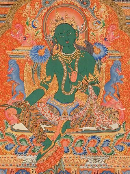 綠度母,是一位救世大菩薩,她坐在白色的蓮花座上,依其本誓,是觀世音菩薩因慈悲天下衆生,傷心時掉下眼淚的變化身,所以是最慈悲的。