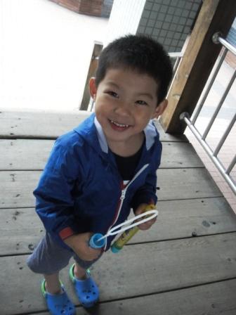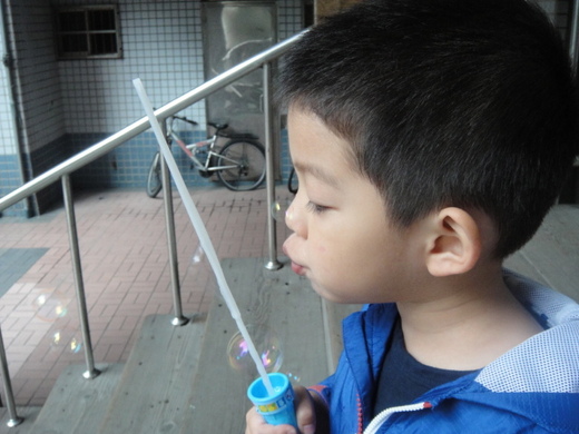 我在上班前就多出來一個小時陪豆豆玩,我們去院子裡玩吹泡泡.