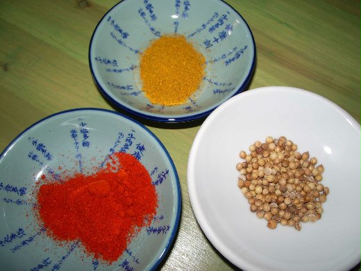 下面照片中的小種子就是香菜籽, 法文 Coriandre. 另外還有咖哩粉跟辣椒粉
