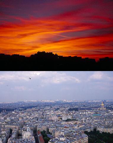 P.S 下方照片右上方出現的黑點是直昇機不是灰塵, 因為解析度的關析, 所以看不太清楚.第 一張是從住家陽台看出去的夕陽,第二張是從位於賽納河邊的阿拉伯大公國文化中心的頂樓咖啡廳照的, 要注意: 千萬不要去那裡喝咖啡或吃東西, 貴死人服務不好又不好吃, 上去看看風景倒是挺不錯的. 另外巴黎一年大約有一千萬的遊客, 比整個大巴黎的人口還多, 所以你在巴黎看到的行人平均兩人就有一人不是巴黎人喽!