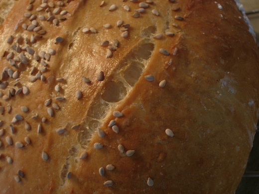 烤箱先以 230度預熱二十分鐘並且在底盤倒入一杯熱水, 然後就可以將室溫下放置約三十分鐘左右的整形好的麵團放入烤箱中烤, 時間大約是二十至三十分鐘, 依烤箱而定, 所以第一次試做時請務必時時去關心一下, 免得烤焦了.等到外皮變成漂亮的深金黃色就完成了.