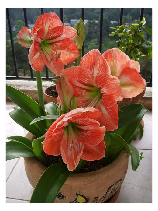 第一張照片是去荷蘭時買的孤挺花, 買了一大顆球莖養了六年, 我分出了五個球莖, 去年搬家沒開花, 今年竟然每個球莖都伸出一根花苞, 算了算至少有十二朵花會開出.