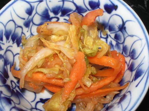做法: 將上述任一組材料切成細絲, 然後用半匙鹽抓一抓醃個三十分鐘, 將出水倒掉, 用冷開水沖一下擠乾, 最後加上一小匙的韓國辣醬, 和菜絲拌勻後即可食用. 辣醬可酌量增減