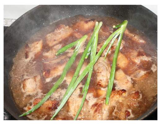 6. 然後打開鍋蓋加入蔥段和鹽用大火翻炒直到收汁即可上桌