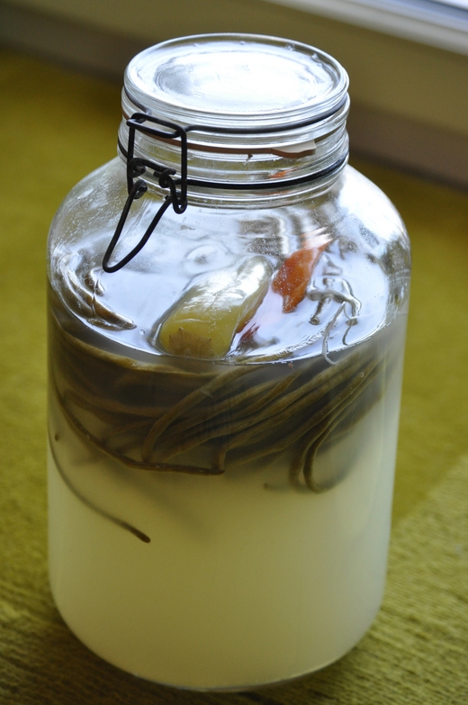 第一先說這個泡酸豇豆的作法,如果有現成的一罈泡菜水,那麼只要把豇豆洗淨晾乾放下去泡個至少五天吧! 最好是七天,長長的豇豆才能酸得夠味夠香。如果沒有現成的泡菜水,那就得自己做。怎麼做呢?很簡單的,但是耐心和清潔不可少。要有等待的耐心,要有乾淨無一丁點油膩的器具,這樣就算成功了一半。成功的另一半則是要挑合適的蔬菜來養泡菜水。最好就用紅蘿蔔,白蘿蔔,芹菜,紅辣椒及嫩薑這幾樣。