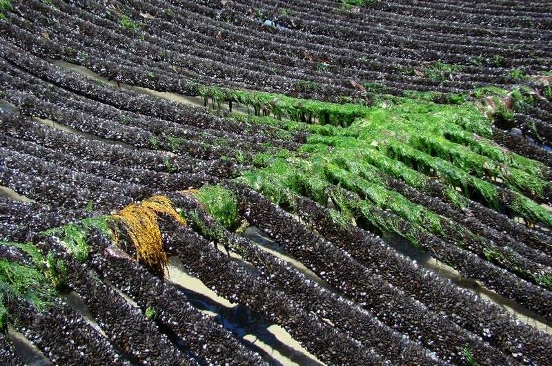 註: bouchot 是種木製的柱子,插在海床上,讓孔雀貝可以附著上去生長。corde 是大的繩子,也是綁在海床上讓moules 附著上去。在法國有這兩種養殖孔雀貝的方法。