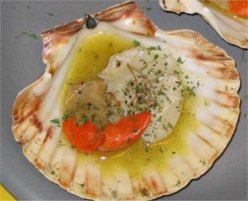等干貝烤好以後將上述醬汁用湯匙舀入殼中澆在干貝肉上,灑上一點切碎的巴西里葉,即可食用.