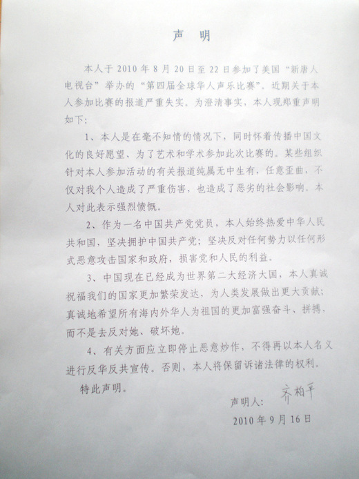 对此,齐柏平非常生气。他在声明中说:“某些组织针对本人参加活动的有关报道纯属无中生有,任意歪曲,不仅对我个人造成了严重伤害,也造成了恶劣的社会影响。本人对此表示强烈愤慨。”“作为一名ZG党员,本人始终热爱中华人民共和国,坚决拥护ZG。本人坚决反对任何势力以任何形式恶意攻击国家和政府,损害党和人民的利益。”