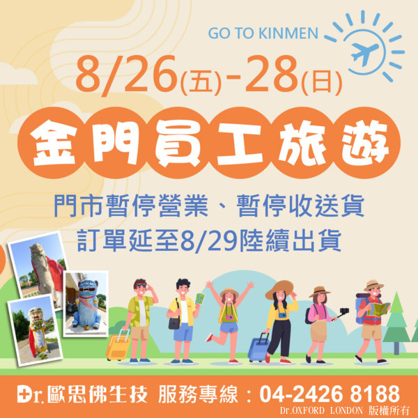 【暫停收送貨公告】 各位歐粉們~大家好 8/26-8/28歐思佛要到金門員工旅遊囉~ 為下半年更好的服務儲存戰鬥力 這幾天公司沒人留守唷~ 親愛的歐粉們記得別白跑一趟, 但我們的官網、蝦皮等其他...