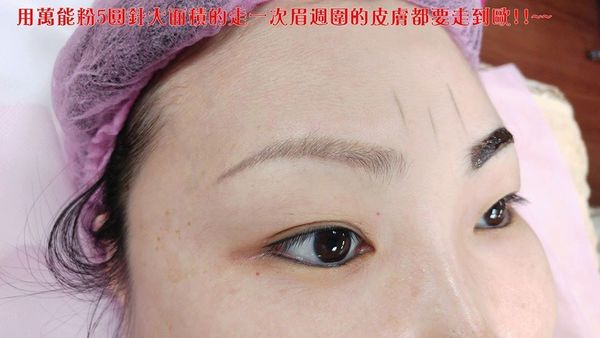 1. 先用5圓針萬能粉紅色乳大面積(要超出原來的眉型歐!!!!),再『藏青眉』上走1次