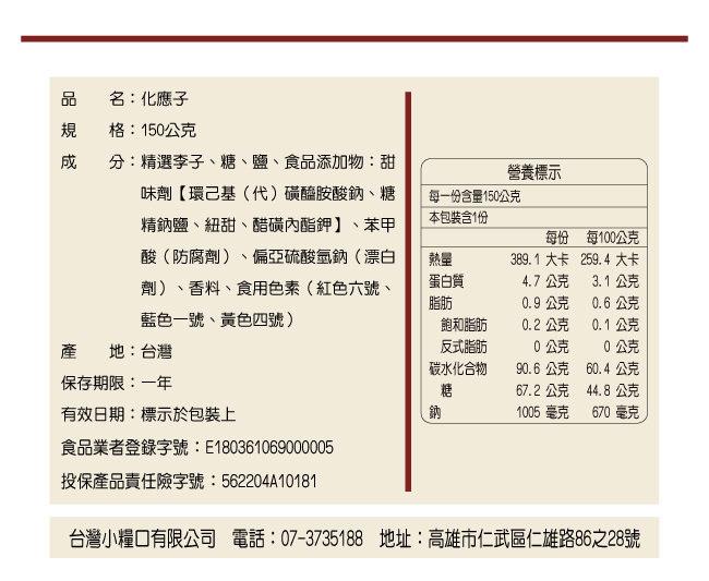 台灣小糧口 化應子150g x6包|梅子/蜜餞 本季最新款,本季限量優惠,本季最新款推薦,春季最新款,夏季最新款,秋季最新款,冬季最新款,本季優惠活動,本季折扣活動,最優惠價格,搶手商品,滿額免運,滿額享折扣,滿額享優惠