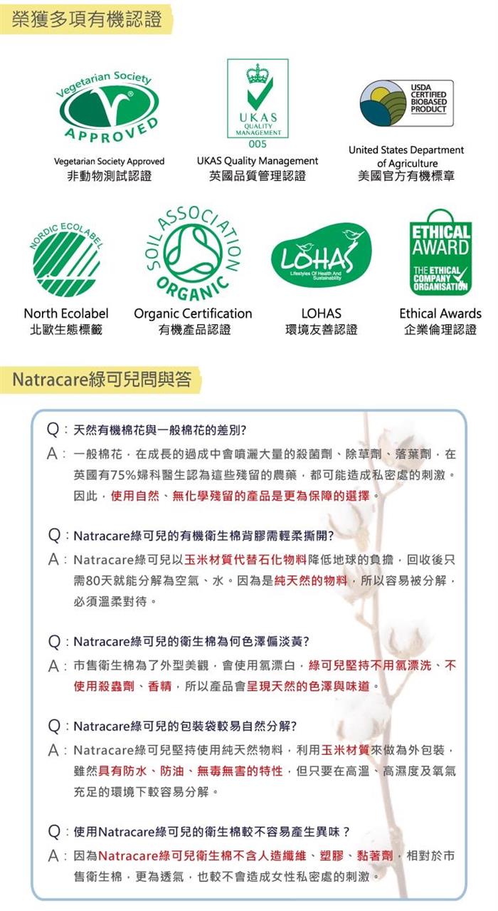無氯漂 不含香料及石油衍生物 幫助您避免陰部過敏症困擾 95 以上可被生物及環境分解 品牌 Natracare綠可兒類型 有機衛生棉適用時間 日用流量 一般型特色 有護翼 翅膀尺寸