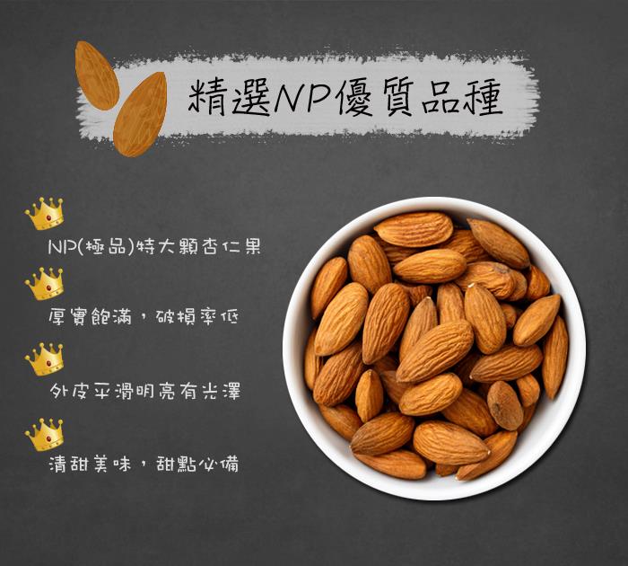 嚴選美國加州極品特大顆杏仁果 外皮平滑明亮有光澤 周年慶刷卡購買折扣厚實飽滿 破損率低 老少皆宜 素食可用 清甜美味 甜點必備 無負擔休閒零食 運動前後補充能量絕佳食物 品名 星宴烘焙