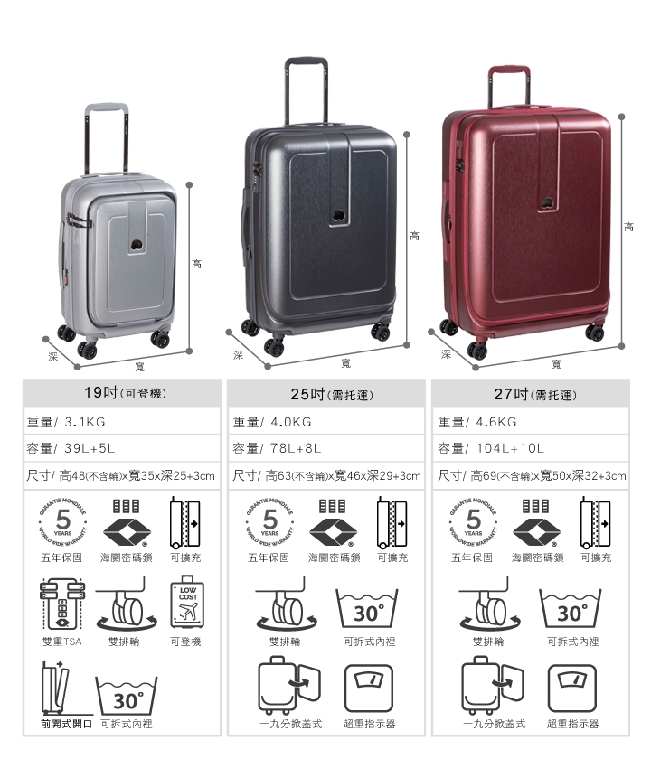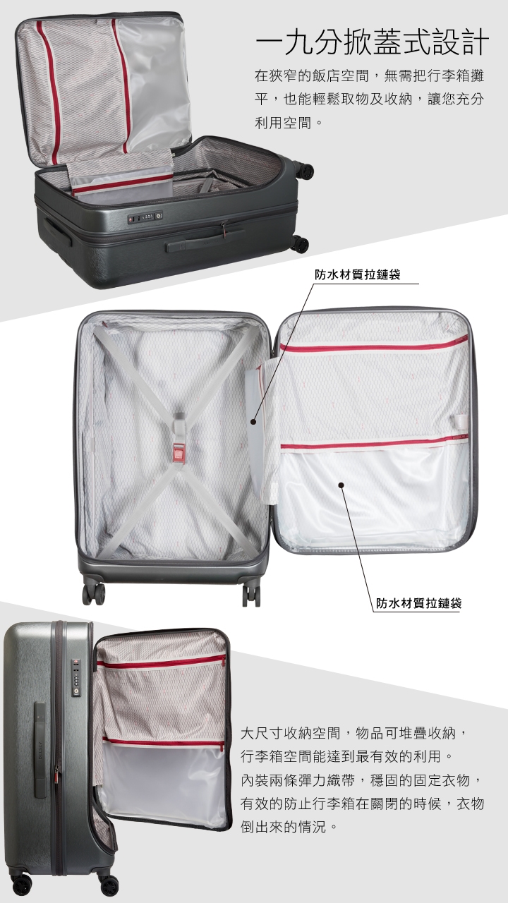 TSA海關鎖 可擴充設計 讓您一箱搞定 X型衣物固定帶 360度萬向輪 品牌 Delsey法國大使尺寸範圍 25 29吋邊框 拉鍊類型 硬殼箱外殼材質 硬殼特色 箱體可加大手把 塑料把手輪子