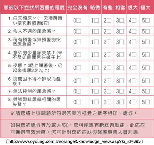 黃文蔚、吳至行,家庭醫師對膀胱過動症應有的認識,基層醫學,第20卷第3期,60-65,2005年。
