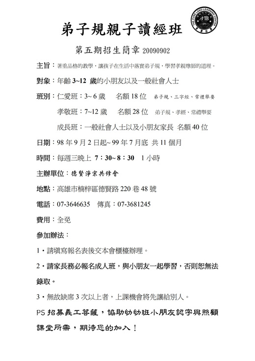 2010/09/01(第六期)弟子規親子讀經班招生簡章
