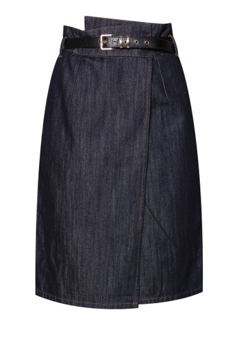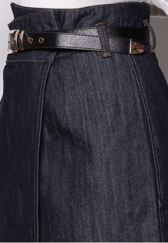 LOST INK 的腰帶裹飾丹寧及膝短裙,丹寧材質配以及膝長度剪裁,有腰帶裝飾,設計休閒百搭。
