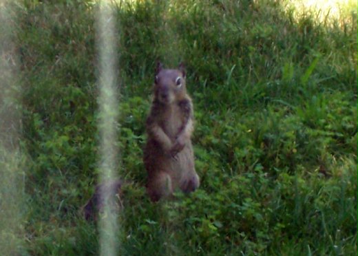 這些小松鼠啊,有時還真的吃飽沒事,不知天高地厚;心血來潮,就跑到我家後院,面對著落地窗的水泥地上,搔首弄姿,耀武揚威!惹得我家貓兒子隔著玻璃窗乾瞪眼,心癢難搔,急到不行,喵喵嗚嗚的直叫。