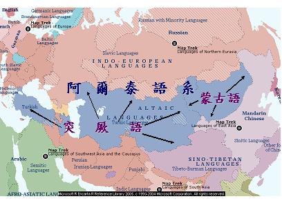 附圖是亞洲地區語言族群圖,中間藍色的一帶是屬於阿爾泰語系,包括蒙古語和突厥語。突厥語系西起哈薩克,向西南一路涵蓋中國新疆的維吾爾人,吉爾吉斯,俄羅斯境內的一些少數民族(吐娃等等),烏茲別克,土庫曼斯坦,越過?海到亞塞拜然,直到土耳其,都是突厥族人。