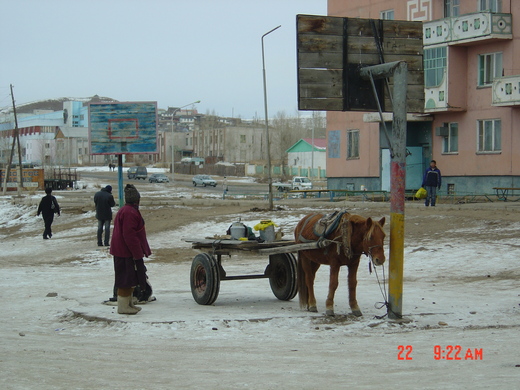 圖一:達爾汗一角。馬車上賣的是牛奶。右方粉紅色的建築是公寓。牛奶是蒙古人喝茶不可或缺的配料。